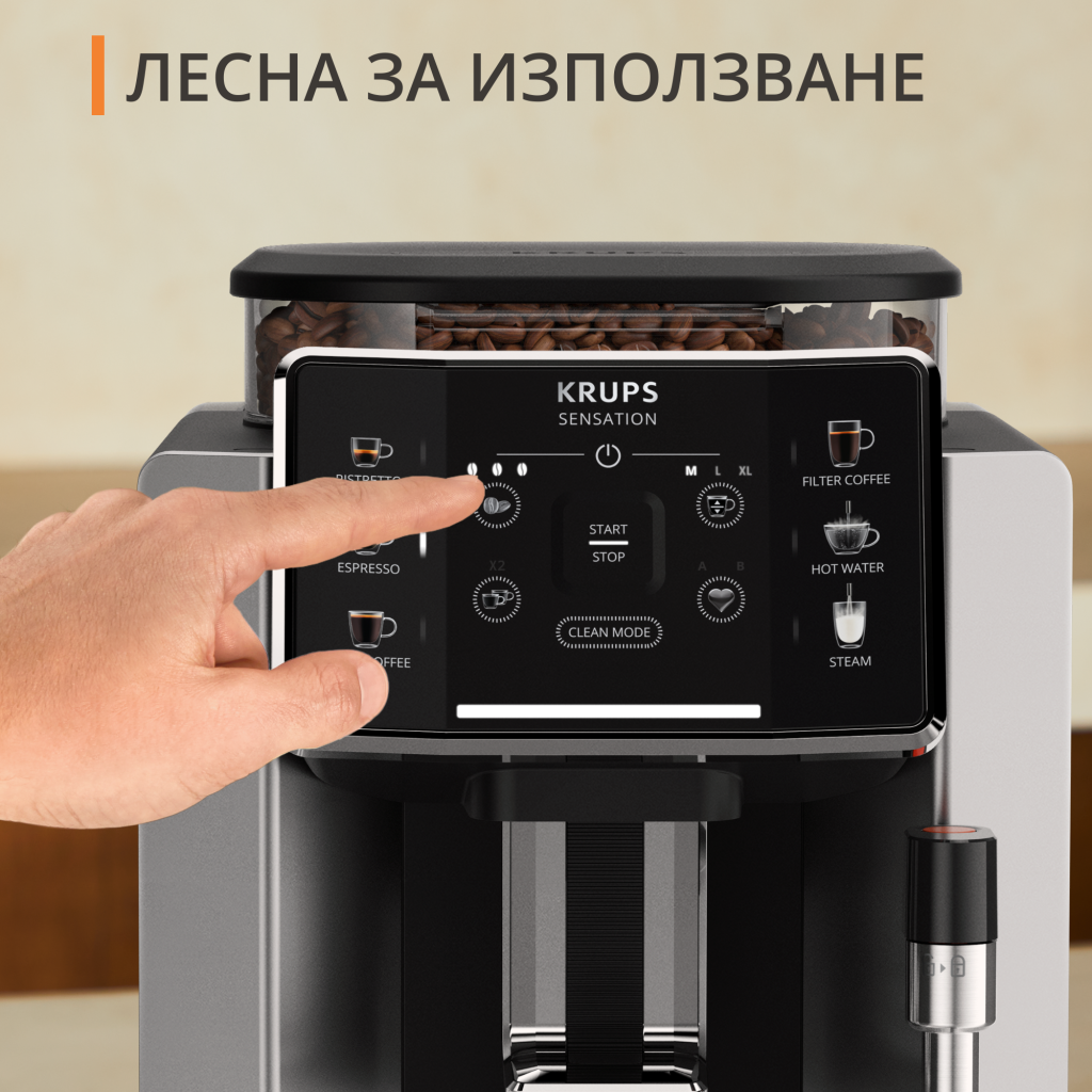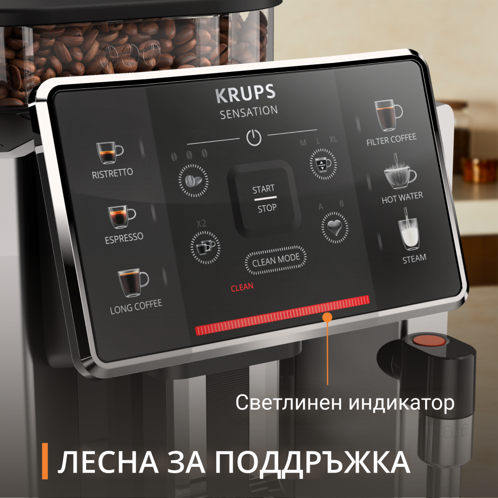 Жадувате за перфектното кафе, но сложността на машината за кафе на зърна ви смущава? Сбогувайте се с всякакви съмнения с Krups Sensation, благодарение на технологията Barista inside, която оптимизира всяка стъпка от процеса на приготвяне на еспресо. С практични функции, като удобния сензорен панел, персонализираните рецепти и светлинните сигнали, насладата от дневната доза кофеин никога не е била по-лесня. Най-хубавото от всичко? Оставете машината да свърши цялата тежка работа с напълно автоматизирана програма за почистване.