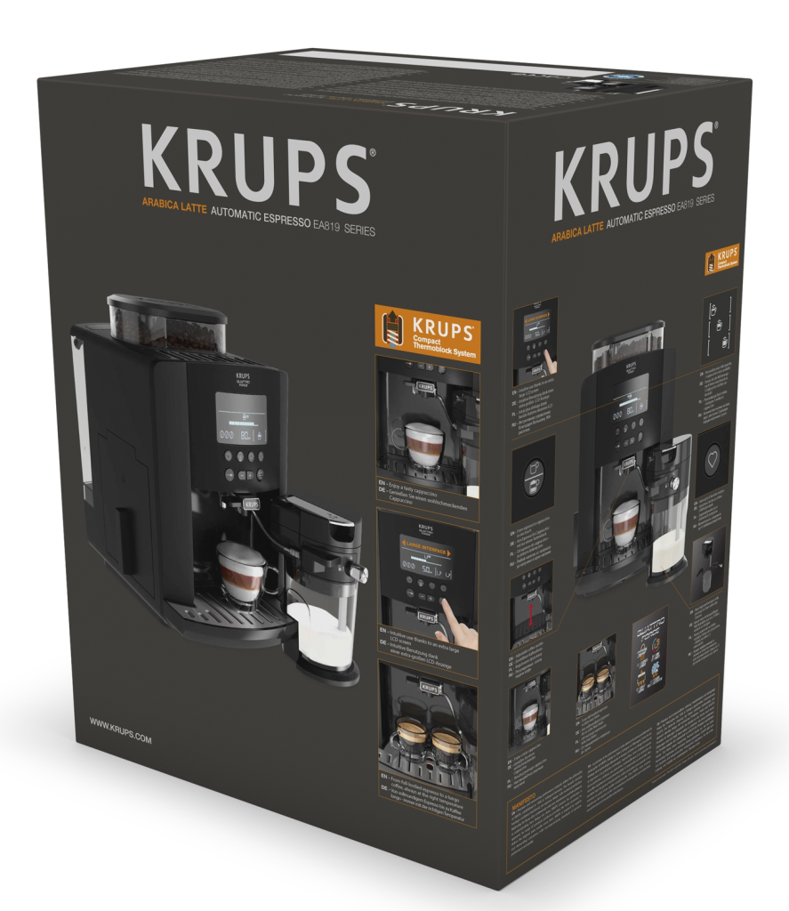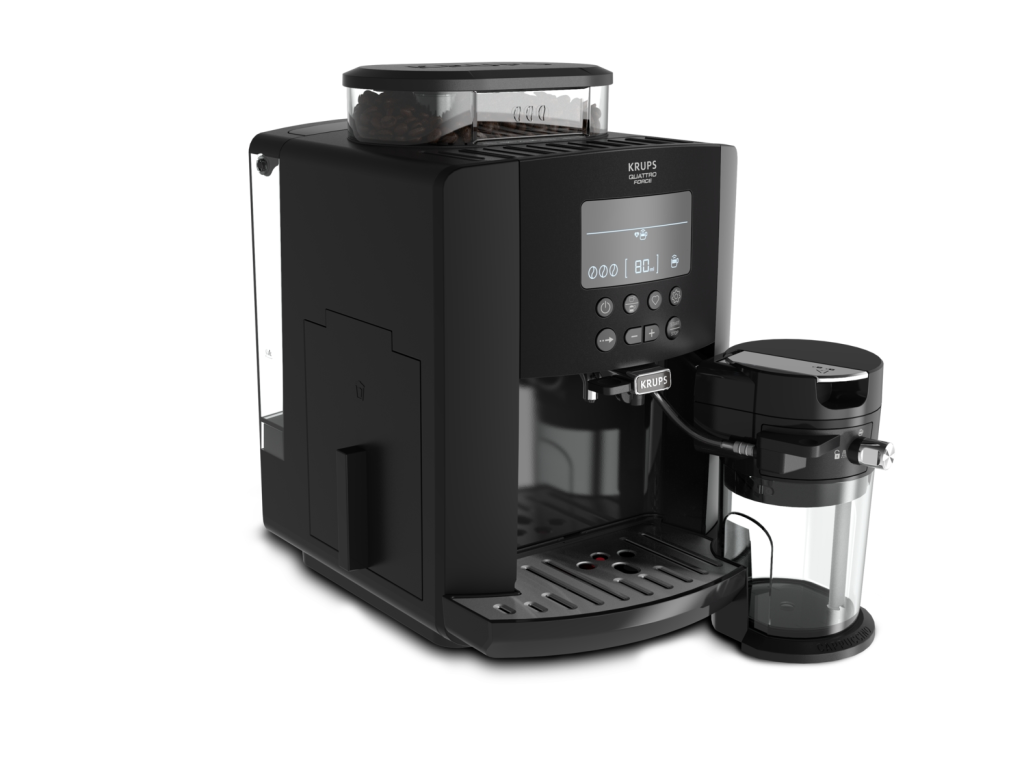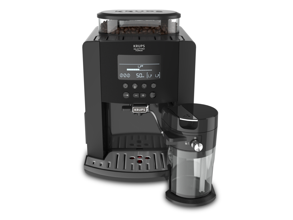 Кафеавтомата Krups Arabica Latte осигурява изключително качество и предлага резултати на ниво бариста за всички ваши любими напитки - от плътно RISTRETTO (ристрето) и LUNGO (лунго) до неустоимо кремообразно капучино. С опростения контейнер за мляко приготвянето на перфектното капучино е на една ръка разстояние. Големият LCD екран прави приготвянето на кафето изключително лесно за потребителя. Системата KRUPS Quattro Force придава изключителен вкус благодарение на технологията, проектирана за оптимално смилане, перфектно уплътняване, извличане на екстракта oт кафето и автоматично почистване.